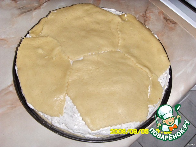 Второй корж делаете по лепешке и раскладываете (тесто не раскатаете по форме, поэтому по кусочкам), на второй корж опять начинку, и на фото последний слой коржа.