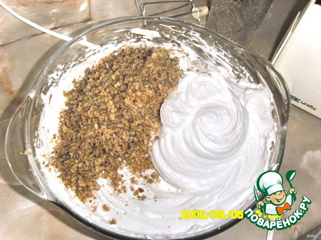 Засыпаем орехи, мешаем методом "разрезания", кладём в холодильник.