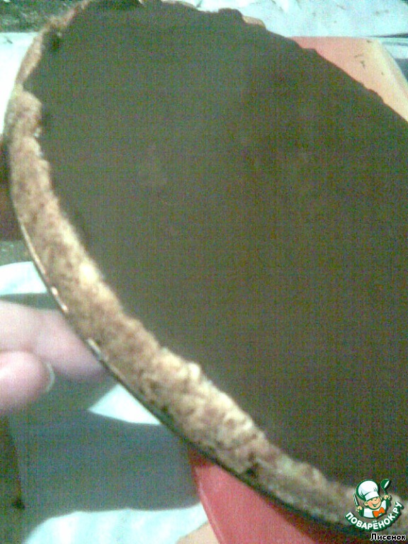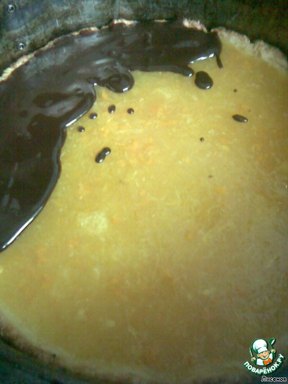 Хорошенько размешиваем до однородности. Корж с застывшим желе вынимаем из холодильника и поливаем остывшим шоколадом.