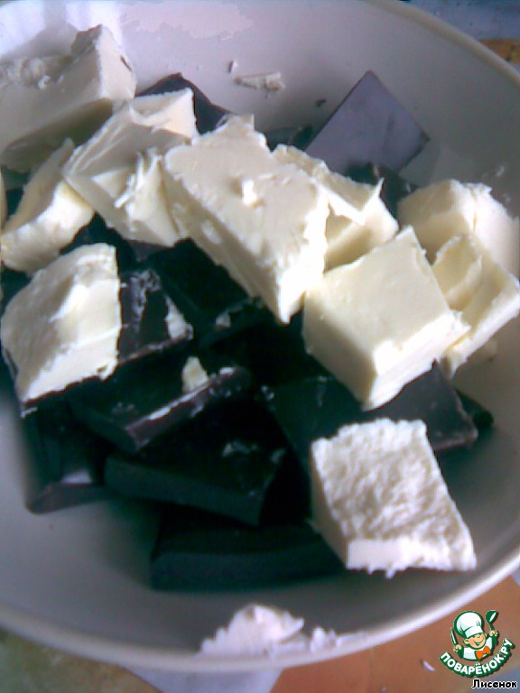 Тем временем ломаем шоколад, масло режем кусочками, добавляем сливки и все вместе растапливаем на водяной бане или в микро.