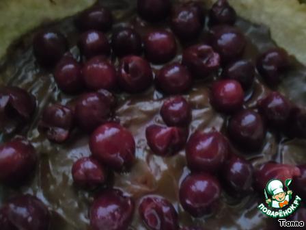 Достать корж из духовки. Смазать его шоколадным кремом и выложить вишни. Я использовала "Крем-десерт а-ля Данетто для микроволновки" http://www.povarenok.ru/recipes/show/46645/ Спасибо Ларисе за рецепт.