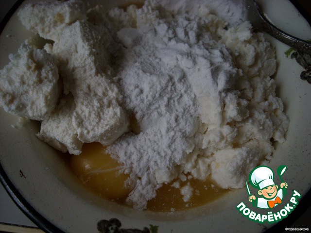 Желтки смешать с творогом, крахмалом, добавить взбитые белки, острожно перемешать и добавить ягоды, масло с сахаром и перемешать.