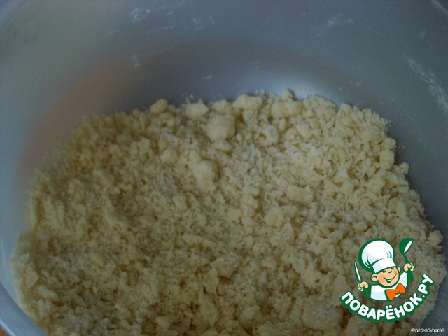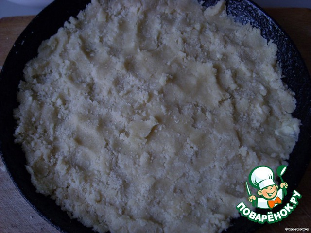 Делаем песочное тесто: масло с мукой растираем в крошку, добавляем сахар и замешивавем тесто. Немного теста оставить для посыпки. Выпечь почти до готовности. (Я поленилась и выложила прям крошкой тесто в сковороду и прижала руками, получился такой же корж.)