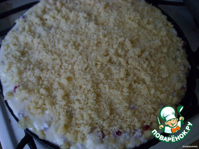 Готовую массу выкладываем на коржи, посыпаем сверху крошкой и запекаем до готовности.
