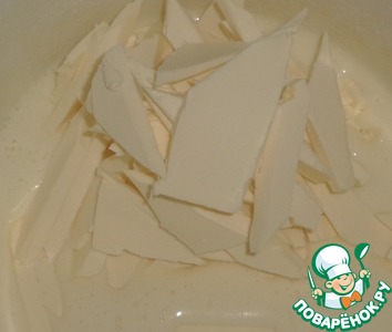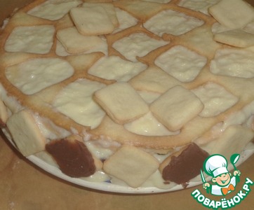 Половину квадратиков из теста обмакнуть в растопленный на водяной бане шоколад. Дать шоколаду подсохнуть. Бока торта смазываем кремом и прикладываем к нему квадратики чередуя их по цвету:светлый, темный, светлый... Торт ставим на пропитку в холодильник на 2-3 часа.