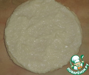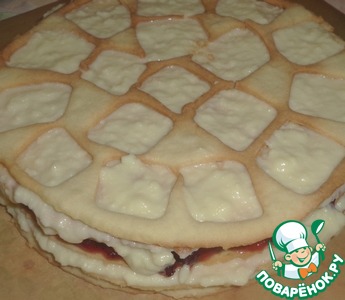 Сверху торт смазываем заварным кремом и кладем на него решетчатый корж.