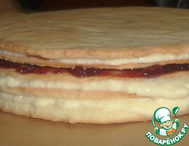 На корж наносим слой заварного крема, сверху укладываем следующий корж и так далее.