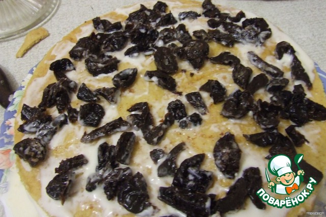 Предпоследний корж я также смазала кремом, но ещё добавила немного чернослива, он придал этому тортику изюминку. Чернослив я предварительно замочила в горячей воде и нарезала.