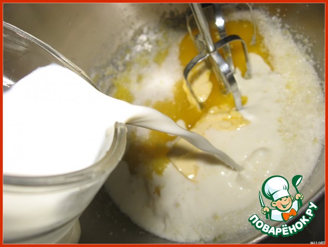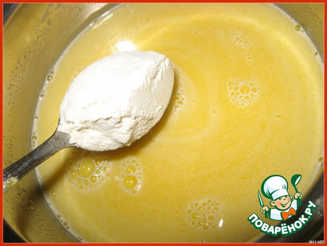 Всыпаем муку, тщательно перемешиваем, чтобы не было комочков.