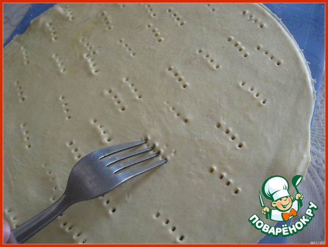 Накалываем тесто вилкой, советую наколоть тесто по краям блина почаще, тогда будет удобней собирать торт, а в середине круга наколоть немного.