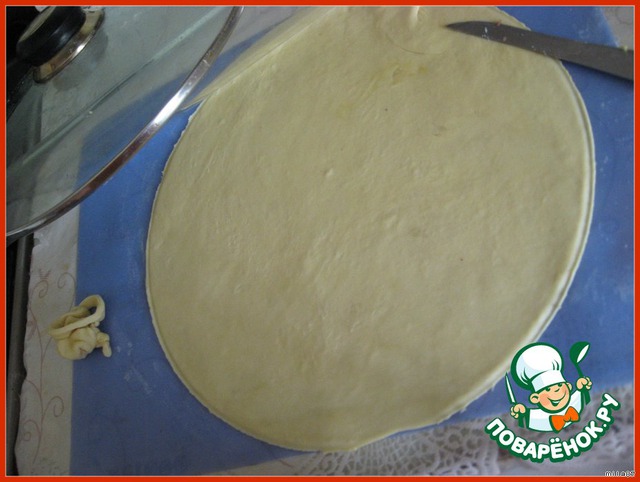 Один шарик берем, остальные убираем в холод. Раскатываем в очень тонкий блин, можно также потянуть блинчик руками...чем тоньше будет блин, тем лучше.