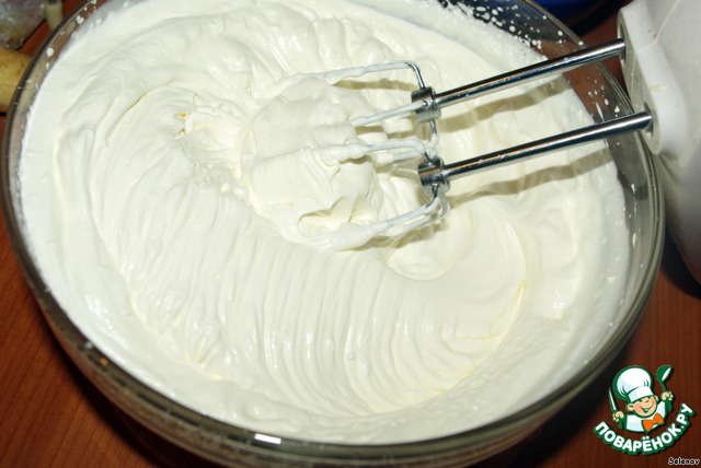 Взбейте 500 мл. сливок с 60 гр. сахарной пудры до получения густой стойкой массы.