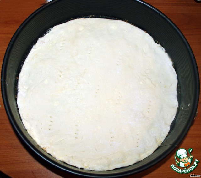 Достаньте тесто из холодильника, раскатайте порцию теста и уложите на дно смазанной маслом формы. В нескольких местах наколите вилкой.