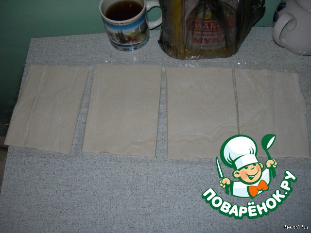 Достаем из морозилки слоеное тесто и даем ему оттаять, но не до конца. Как только при нажатии на упаковку будет чувствоваться "мягкость" - значит, пора готовить
