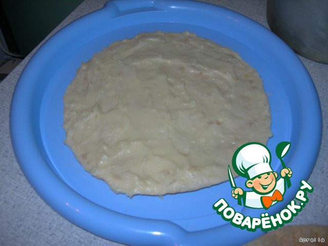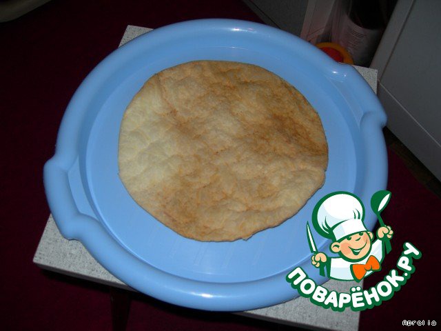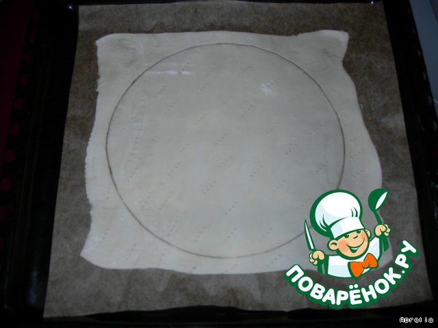 Каждую из частей раскатываем в квадрат и придаем желаемую форму. Я это делала крышкой от самой большой сковороды - сильно надавливала по всей окружности, но не до конца.