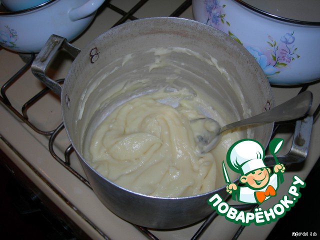 Пока коржи готовятся, можно заняться кремом. Для этого нужно взбить в кастрюле молоко, яйца, сахар, муку и соль. Все это поставить на водяную баню и варить до загустения, постоянно мешая, чтобы не было комочков.