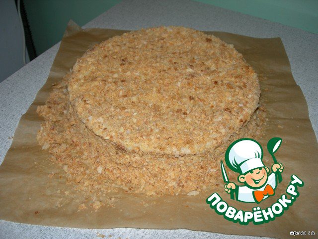 Перекладываем торт на бумагу, на которой выпекались коржи. Остатки теста (те, что были вокруг наших коржей, после придания им желаемой формы) крошим и украшаем ими торт сверху и по бокам. Сверху просто равномерно посыпаем, а по бокам - берем крошки на ладонь и прижимаем ее к боковине, и так делаем по всей окружности, помогая себе бумагой, на которой стоит торт, слегка приподнимая концы, чтобы большее количество крошек "прилипло" к торту.