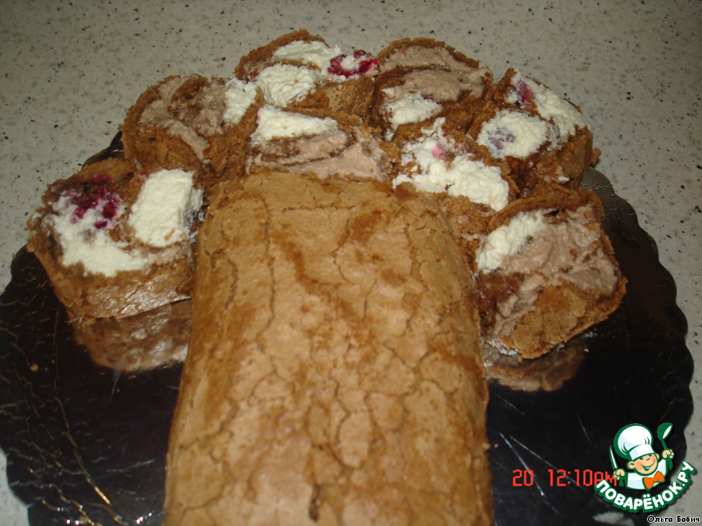 Промазывая кремом рулет, чередуем - шоколадный крем, свернуть, белый крем с прослойкой малины и т.д.