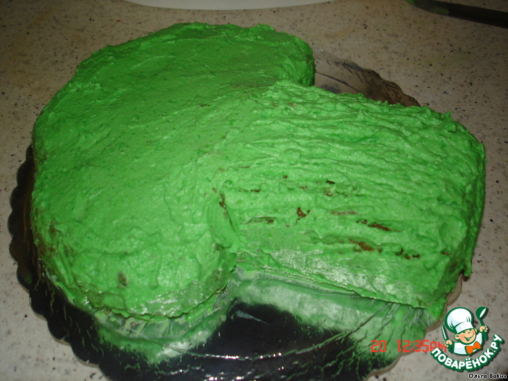 Взбить оставшиеся сливки с сахарной пудрой, добавить зеленый пищевой краситель.