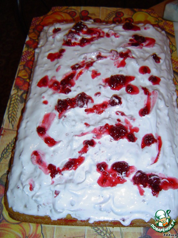 В оставшиеся белки добавляем малиновое варенье и аккуратно перемешиваем, наносим этот крем на второй корж.