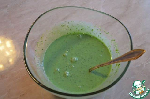 Пока крем остывает, берем пучок шпината, рубим его, в чашу блендера выкладываем шпинат, вбиваем яйцо и промалываем до тех пор, пока масса не станет зелено-однородной.