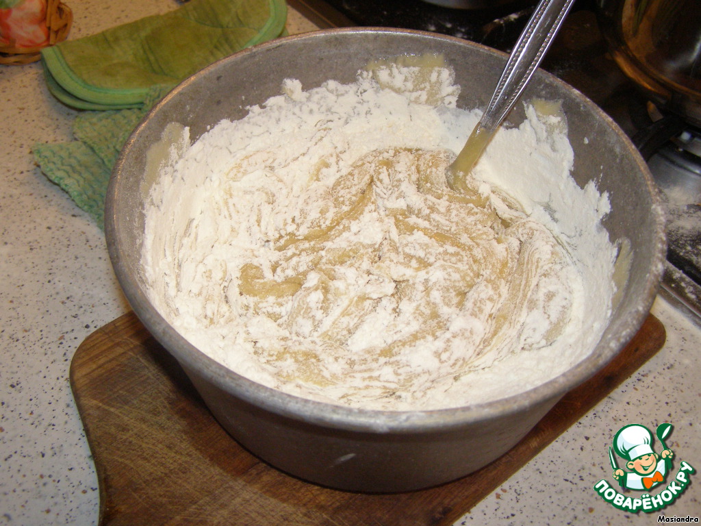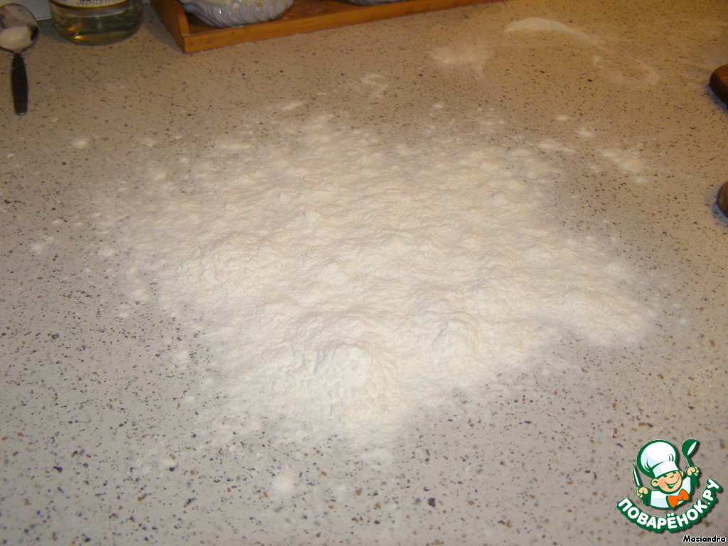 Снять кастрюлю с пара. На стол высыпать 1 стакан муки.