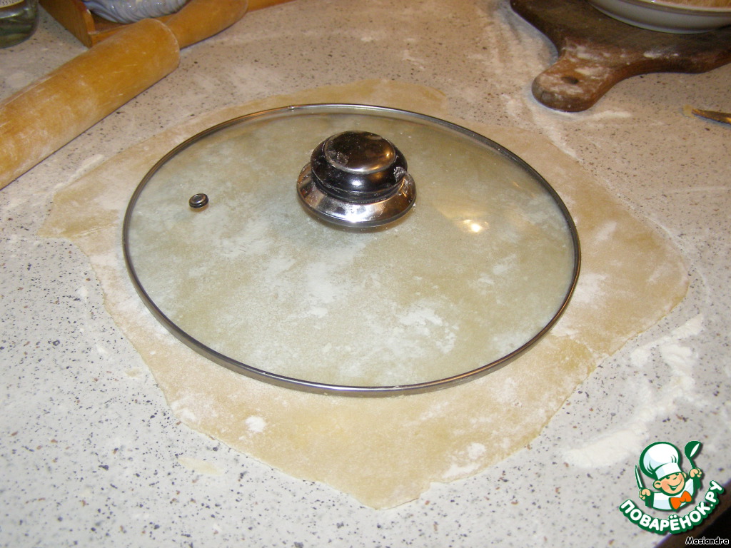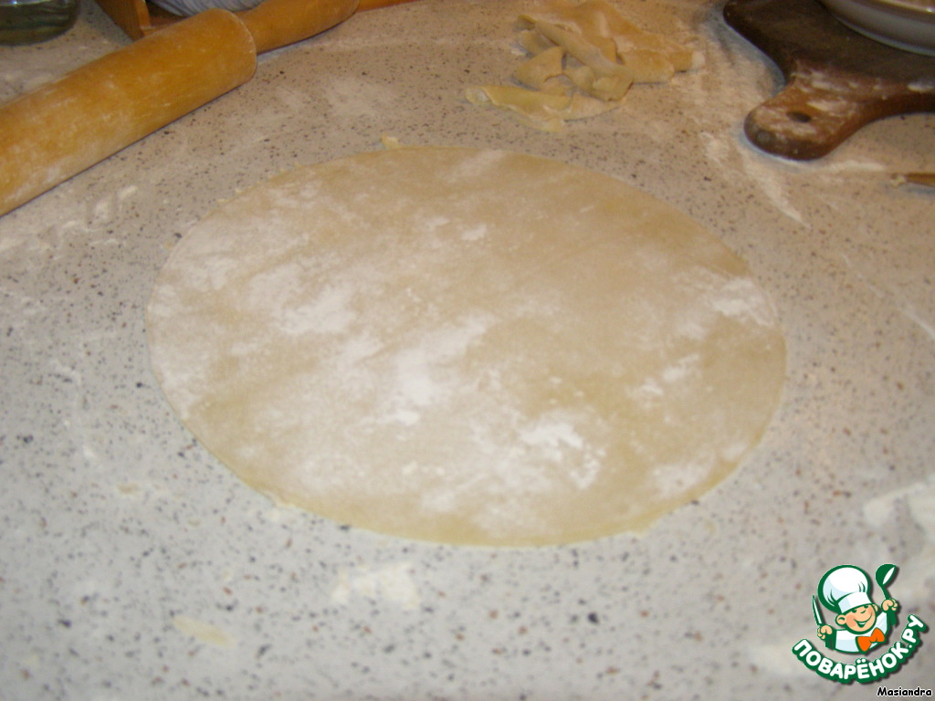 Раскатываем тесто максимально тонко, хорошо присыпая мукой стол и скалку. Обрезаем по необходимой форме.