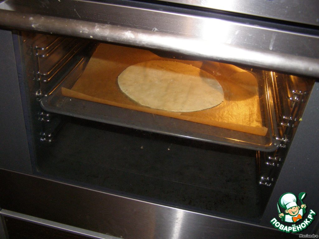 Готовый корж выкладываем на противень, выстланный пергаментом, и отправляем в духовку.