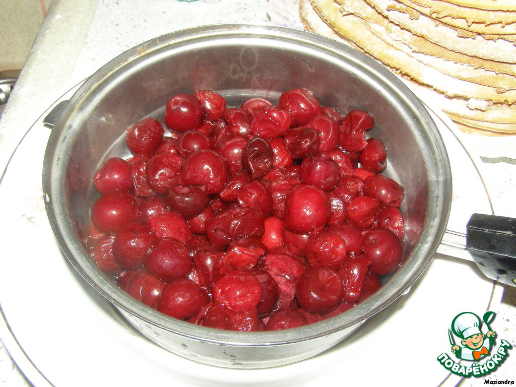 Пока печем коржи - размораживаем вишню (если она замороженная)