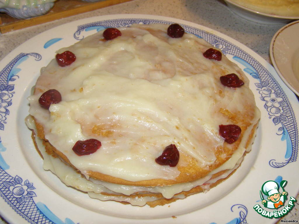 Выкладываем на блюдо для подачи пропитанный корж, смазываем его кремом и выкладываем вишню в произвольном порядке.