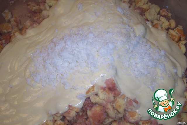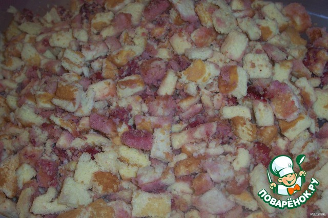 рулеты режим на кусочки,потом эти кусочки режим на маленькие кубики, перемешать с клубникой и кокосовой стружкой,залить ещё тёплым кремом, перемешать. добавить 2-3ст.л фруктового ликёра ещё перемешать.