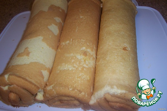 все ингредиенты для теста делим на три части,готовим тесто,выпекаем рулетные коржи,при температуре 175гр,10 минут,сворачиваем в рулет и даём полежать 1час.