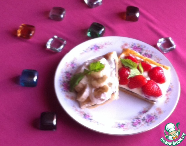 На крем выкладываем фрукты или ягоды. У меня были бананы и клубника, хотя их можно заменить любыми по своему вкусу. Бананы я слегка сбрызнула лимонным соком, чтобы не темнели.