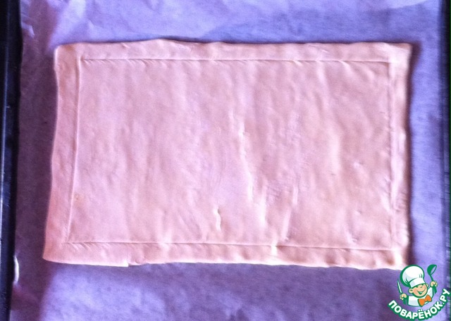 Слегка раскатаем тесто, чтобы получить прямоугольник размером30*20 см, поэтому его нужно взять в рулоне. Отступив 1 см от края ножом сделать надрез по периметру, не прорезая наш корж насквозь.