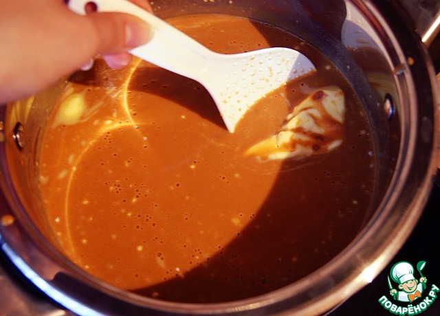 Вылить в кастрюльку. Кастрюльку с массой поставить на средний или большой огонь и при постоянном помешивании довести до загустения. Крем должен приобрести вид густой манной каши.