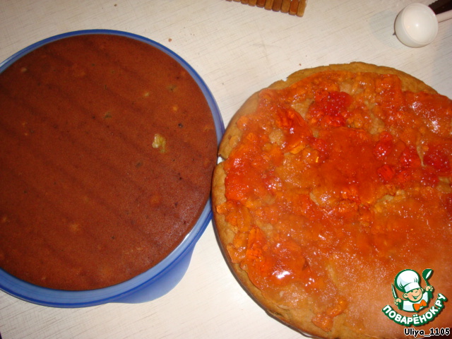Когда желе застынет (надо не меньше 8 часов) - начинаем собирать торт.
