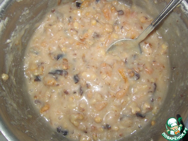 Смесь масла с сахаром смешать с остывшим кремом, взбить миксером, добавить сухофрукты и орехи.
