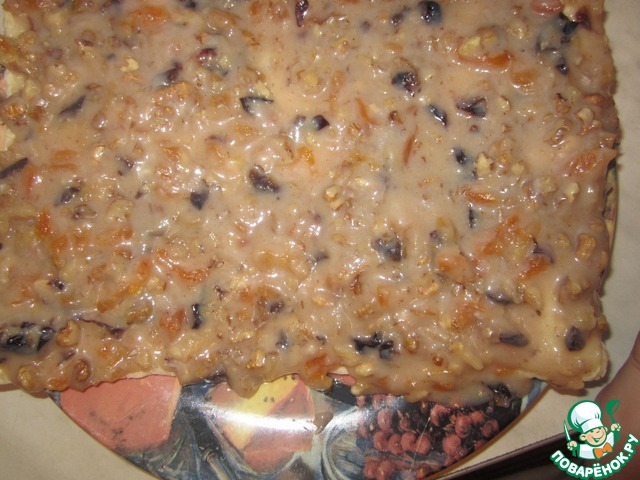 | Воздушный торт из слоеного теста с кусочками сухофруктов и грецким орехом. |