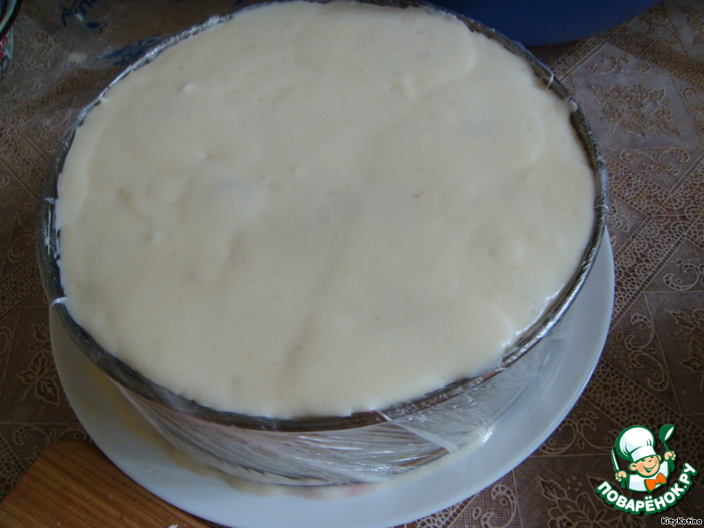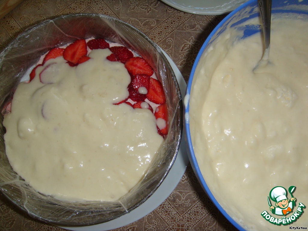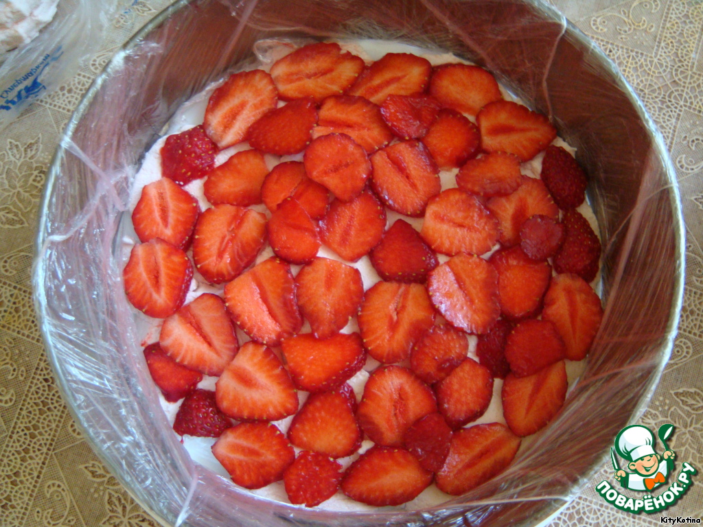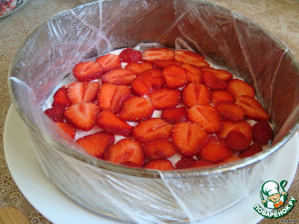 Теперь берем разъемную форму, убираем дно, а "стенку" формы ставим на блюдо с зефиром и клубникой. Я предварительно обмотала форму пищевой пленкой, т.к. побоялась, что тортик приобретет привкус железа. Форма у меня не новая, так что, решила перестраховаться :)