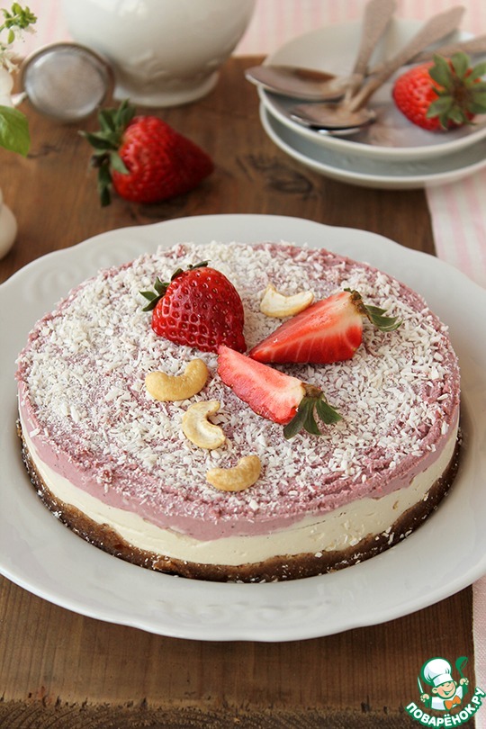 Украсить по желанию, у меня кокосовая стружка и пару клубничек. Орехи кешью как бы символизируют из чего сделан торт, но никому из дегустаторов эта подсказка не помогла) На мой вопрос из чего сделан этот десерт, версии были такие - творог, карамель, орехи, йогурт, мороженое))) Честно, если бы не я его делала, и сама бы врядли отгадала основной ингредиент.