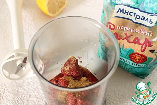 Клубнику (у меня замороженная) разморозить, сок слить, для пюре взять только ягоды. Клубнику, 1 ст. л. лимонного сока и 1 ст. л. сахара Демерара fine от Мистраль пюрировать в блендере.
