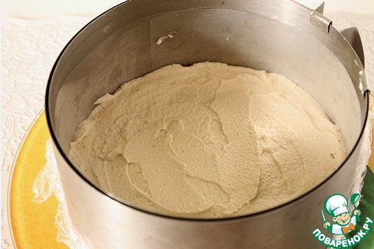 Дно и бортики формы выложить пищевой плёнкой или бумагой для выпечки. У меня разъёмное кольцо диаметром 16 см, получается небольшой тортик на 4-5 порций. Но это настолько вкусно, что смело можете увеличивать пропорции и делать в форме побольше.