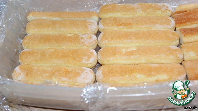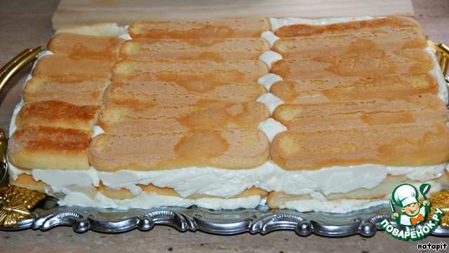 Вылить половину слегка загустевшего крема и выстелить сверху печеньем савоярди, которое так же смочить молоком и залить оставшимся кремом, сверху посыпать шоколадом, слегка притопив его в креме. Выстелить оставшееся печенье и смочить его молоком.