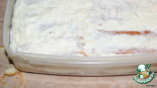 На дно формы выстелить печенье (количество зависит от того, 2-х или 3-х слойный торт вы будете готовить и от размера формы) и обильно смочить его молоком, в котором растворить сахарную пудру, с помощью кисточки.
