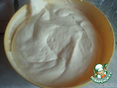 Взбиваем хорошо(я это делала в блендере) желтки+ сахар+сливки. Можно взять сливки и в пакете. Тогда их предварительно приготовить, а только потом добавлять. После отдельно взбиваем белки(я в белки добавляю еще немного сахара где-то 100г). После аккуратно вводим в сметанно-сливочную массу. В принципе вот это крем и готов, но... чтоб он лучше держал форму я добавляю туда еще разведенный желатин(мне так больше нравится,потому что иногда попадаются разные сливки, да и сметана тоже).Это проверено неоднократно.