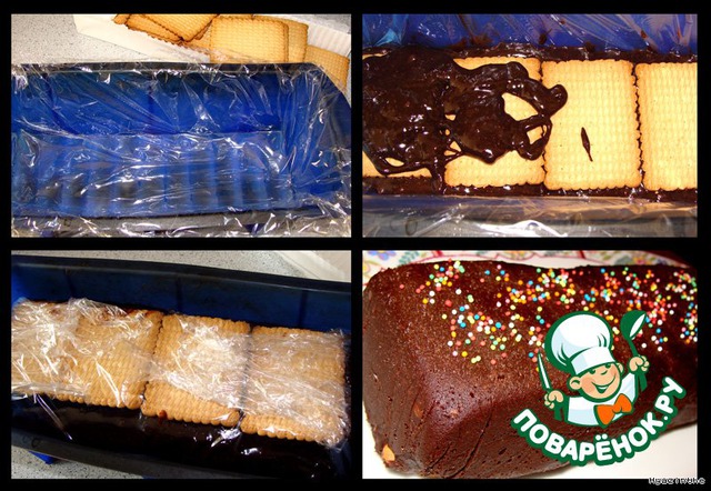Загибаем края пленки наверх и ставим наше творение в холодильник на несколько часов, а лучше до утра, чтобы хорошо пропиталось печенье.