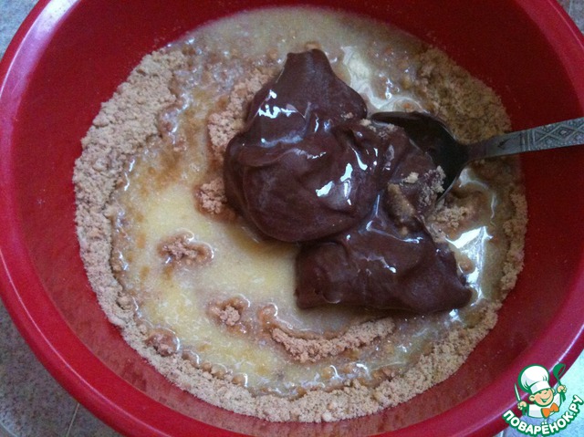 …и добавляем в него Нутеллу (4 ст. л.) и растопленное сливочное масло (100 г). Тщательно все перемешиваем.