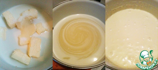 Ну а теперь займемся вкуснейшей молочной начинкой! Все продукты для начинки надо разделить на 2 части, поскольку между слоями надо будет заливать «карамель», а данная начинка ну очень быстро застывает) Итак, смешиваем молоко (100 мл), сливочное масло (100 г), сахар (75 г) и ванилин в миске. Доводим до кипения всю эту массу. Затем обязательно дожидаемся, когда она остынет, и добавляем ½ часть сухого молока. Взбиваем миксером до кремовой консистенции, чтобы не было комочков.