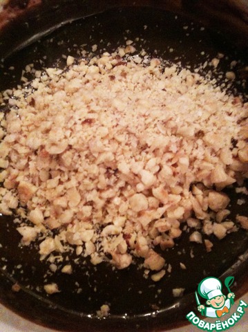 Для шоколадной глазури растапливаем на водяной бане темный и белый шоколад, а затем добавляем в эту смесь очищенный и мелко раздробленный фундук. Шоколадно-ореховой массе обязательно даем остыть, а затем равномерно распределяем ее поверх торта.