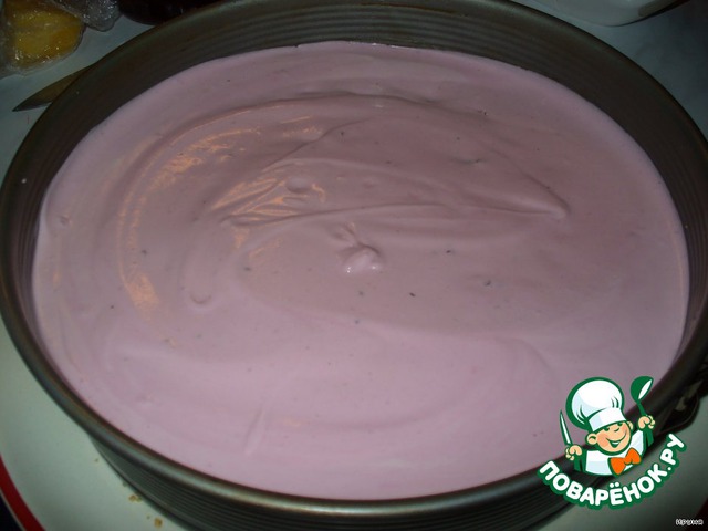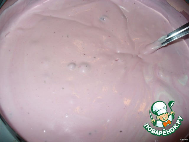 В ягоды добавить йогурт, перемешать. 600мл сливок взбить и примешать в массе.